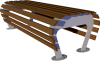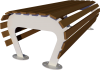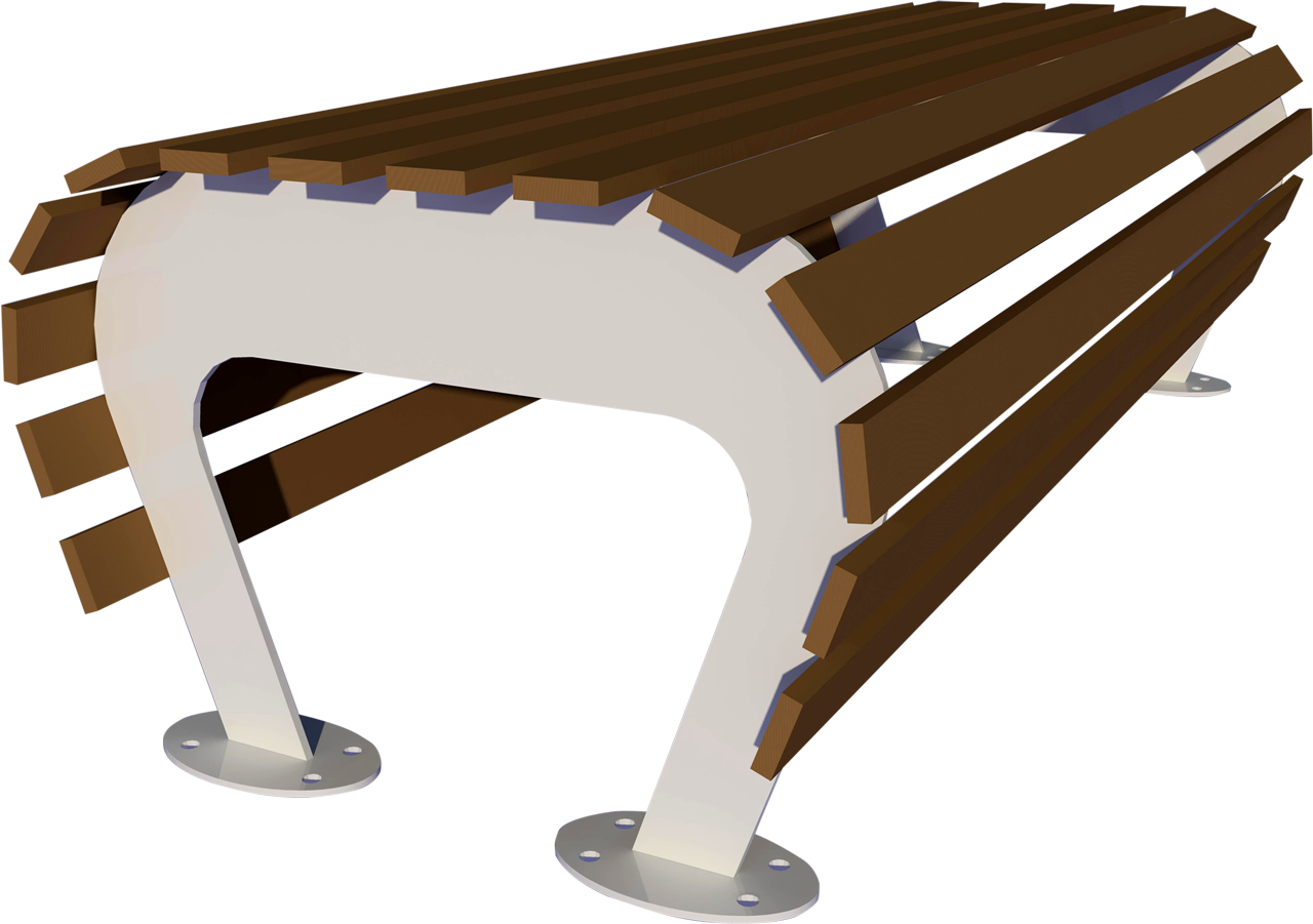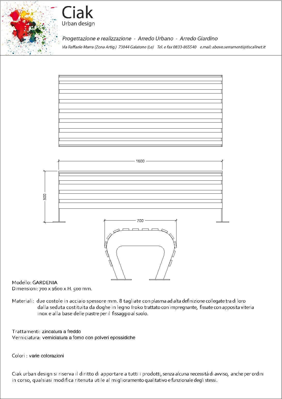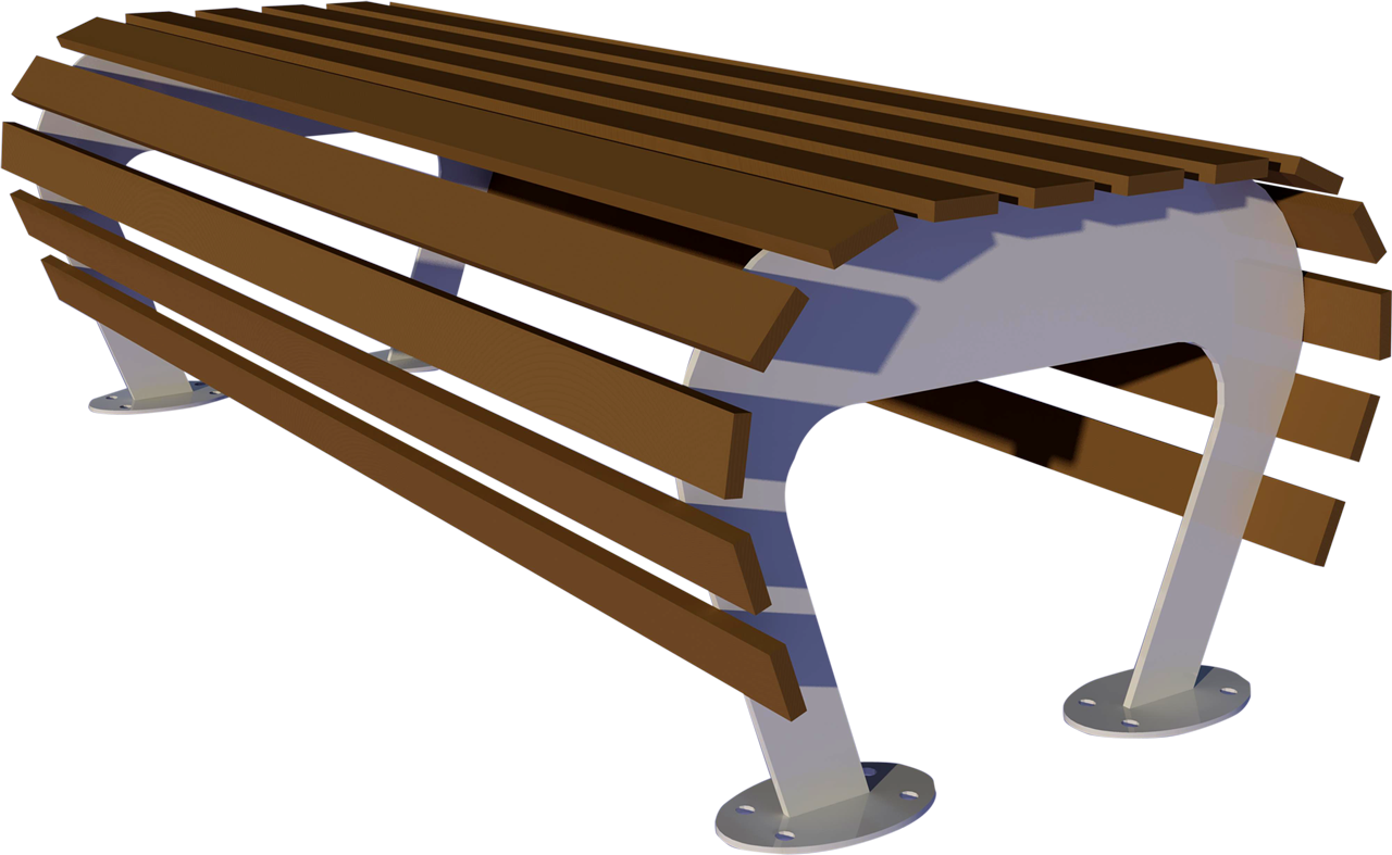 Materiali: due costole in acciaio spessore mm. 8 tagliate con plasma ad alta definizione collegate tra di loro dalla seduta costituita da doghe in legno Iroko trattato con impregnante, fissate con apposita viteria inox e alla base delle piastre per il fissaggio al suolo.
