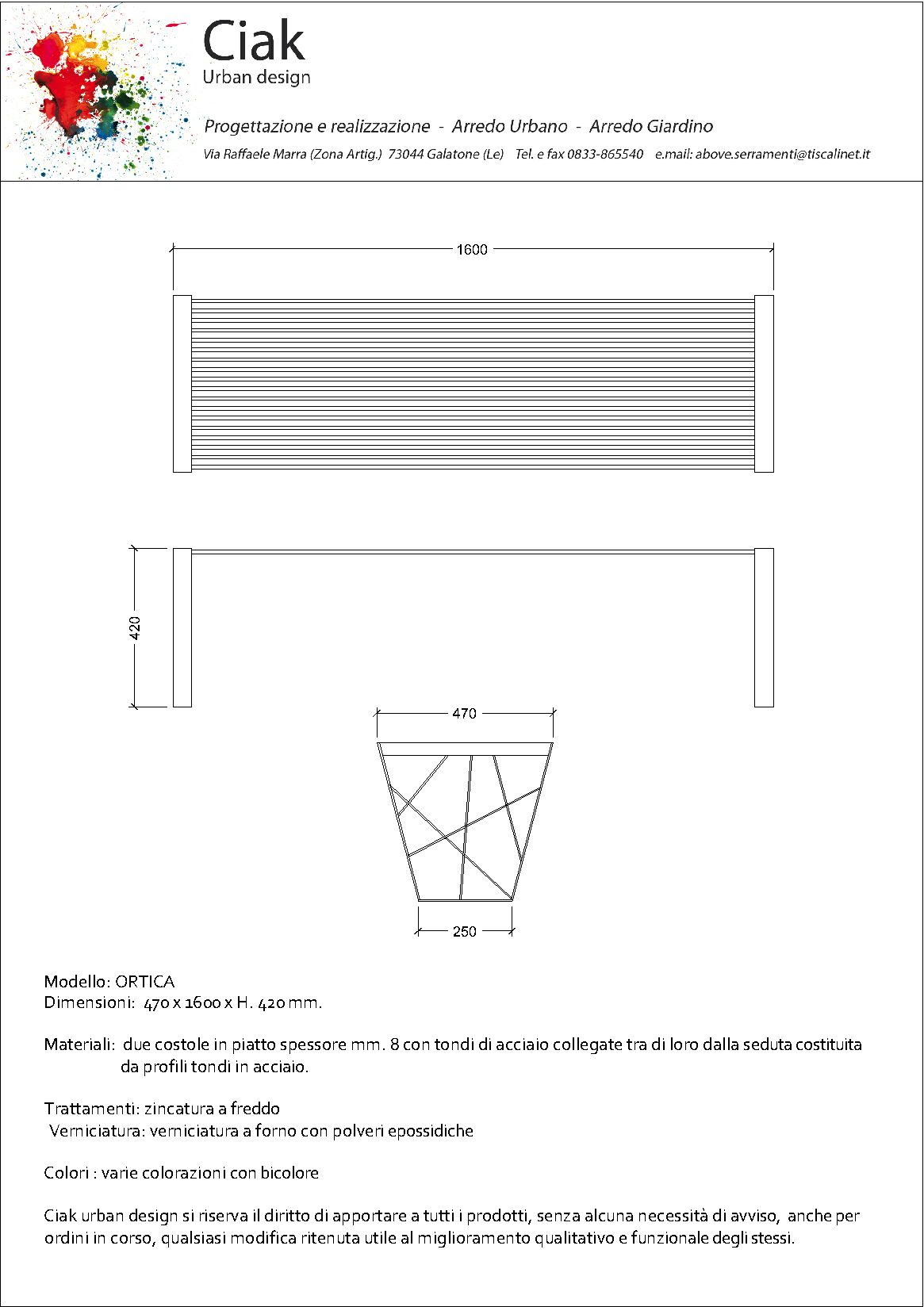 Materiali: due costole in piatto spessore mm. 8 con tondi di acciaio collegate tra di loro dalla seduta costituita da profili tondi in acciaio.