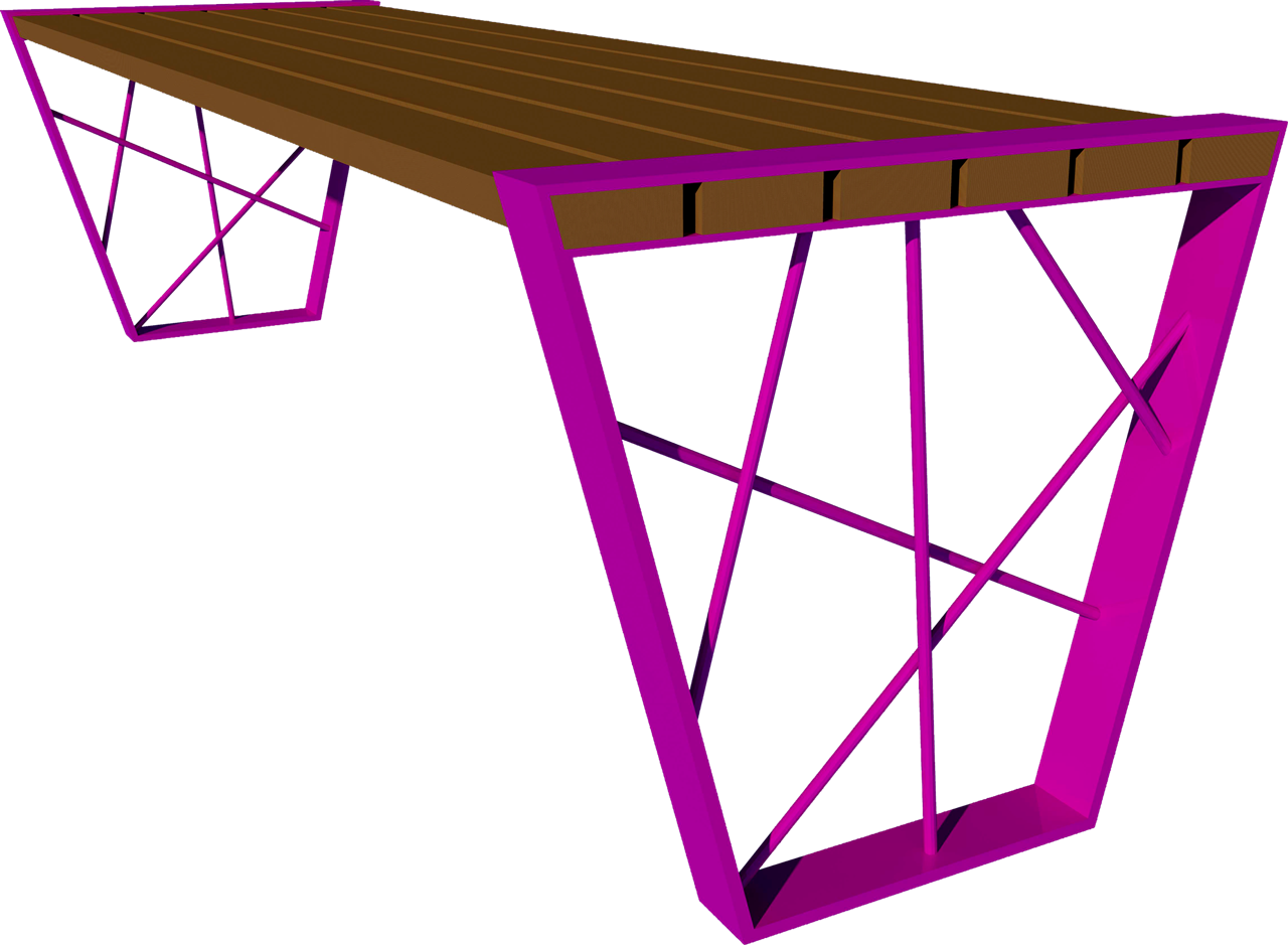 Materiali: due costole in piatto spessore mm. 8 e tondi di acciaio collegate tra di loro dalla seduta costituita da doghe in legno Iroko trattato con impregnante e fissate con apposita viteria inox.