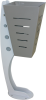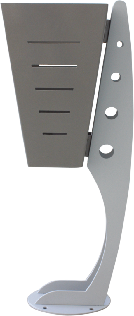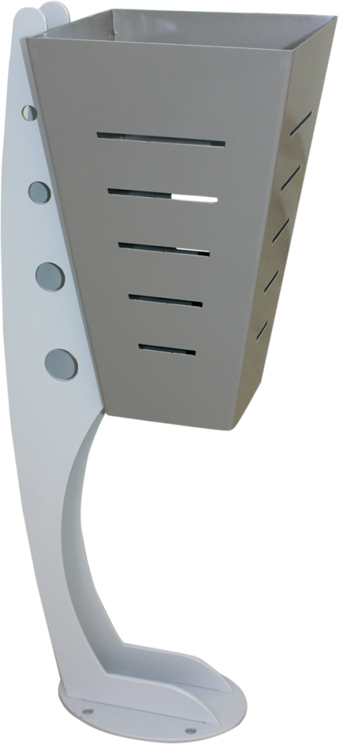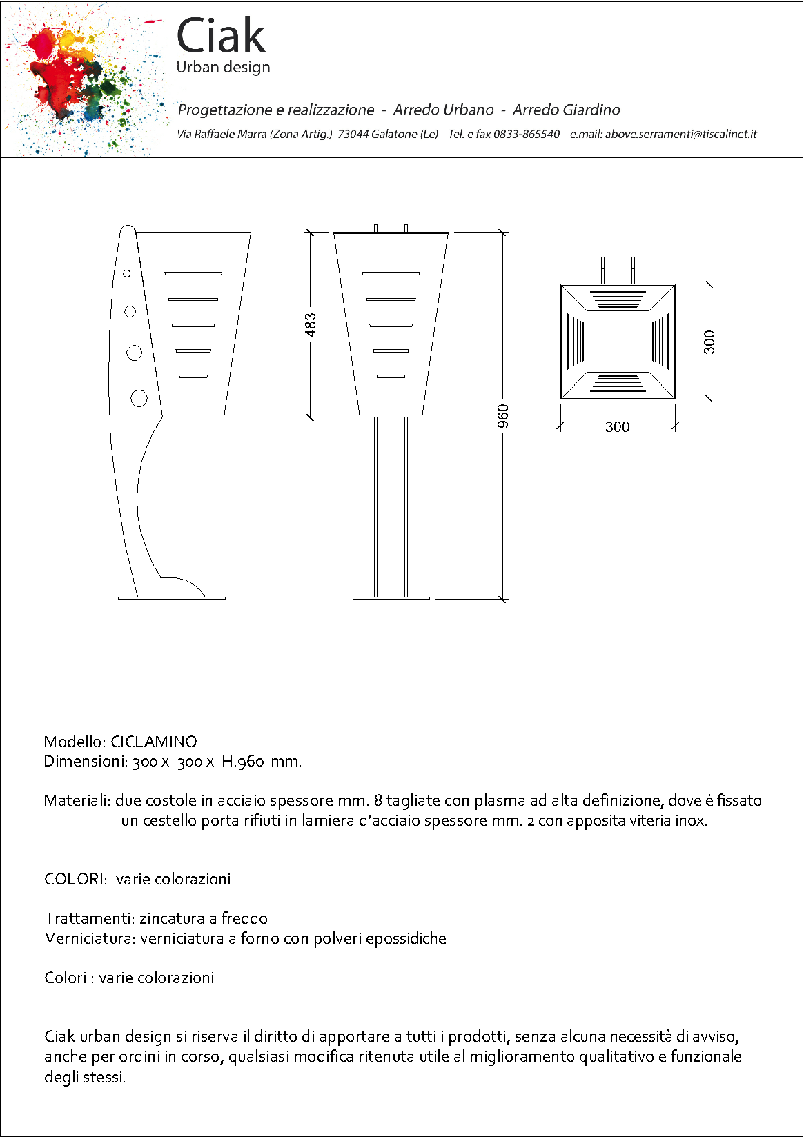 Materiali: due costole in acciaio spessore mm. 8 tagliate con plasma ad alta definizione, dove è fissato un cestello porta rifiuti in lamiera d’acciaio spessore mm. 2 con apposita viteria inox.