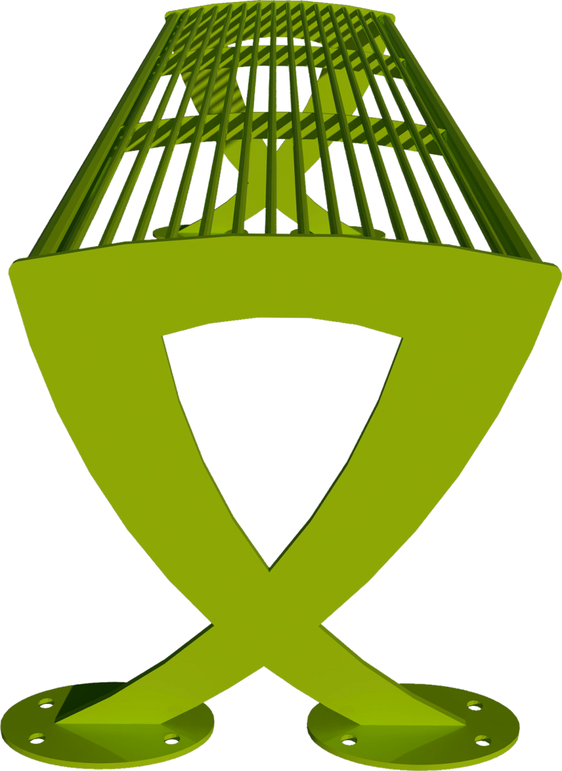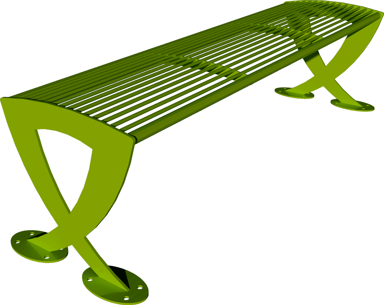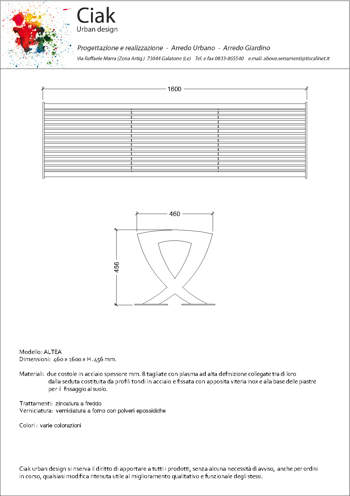 Materiali: due costole in acciaio spessore mm. 8 tagliate con plasma ad alta definizione collegate tra di loro dalla seduta costituita da profili tondi in acciaio e fissata con apposita viteria inox e alla base delle piastre per il fissaggio al suolo.