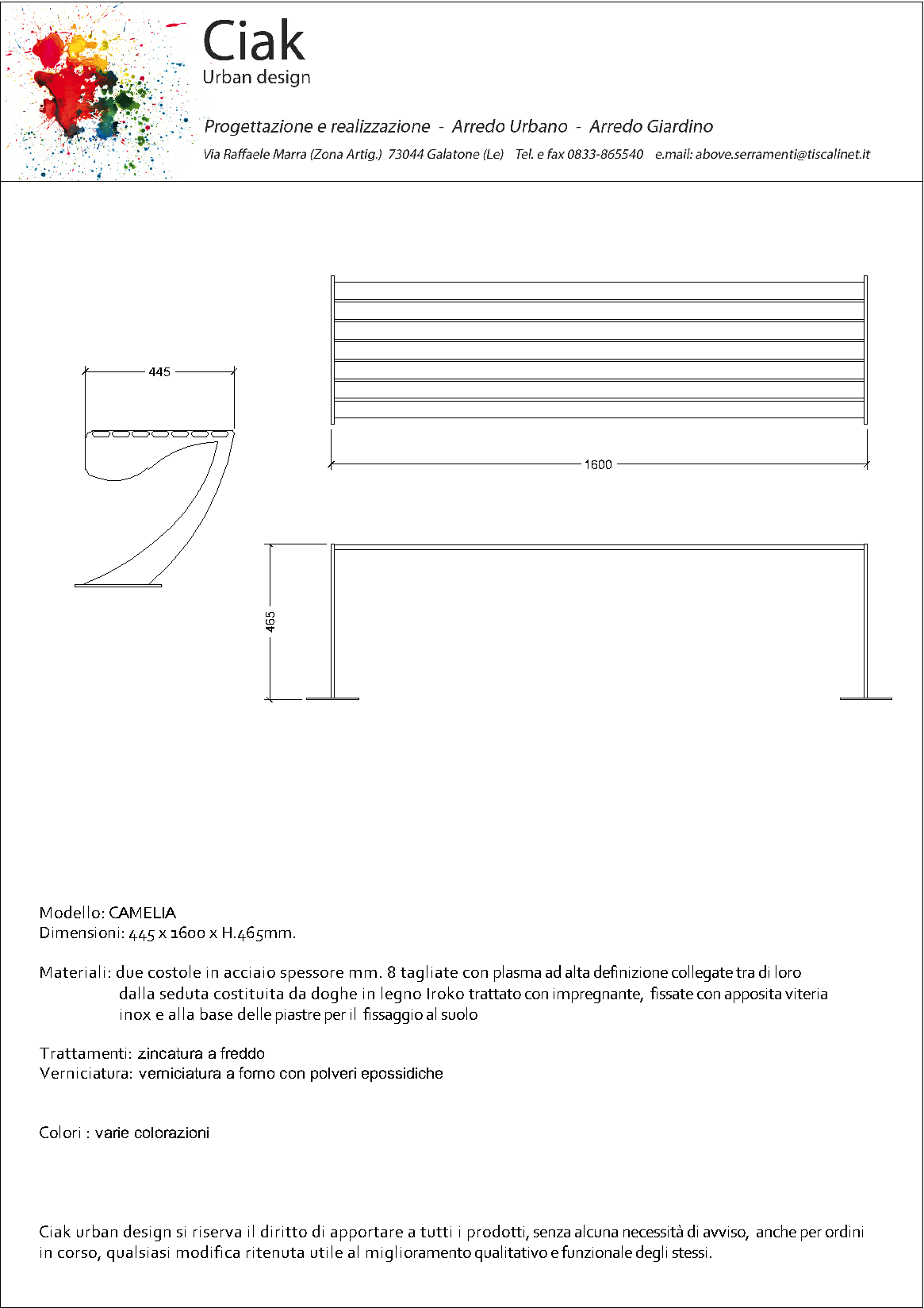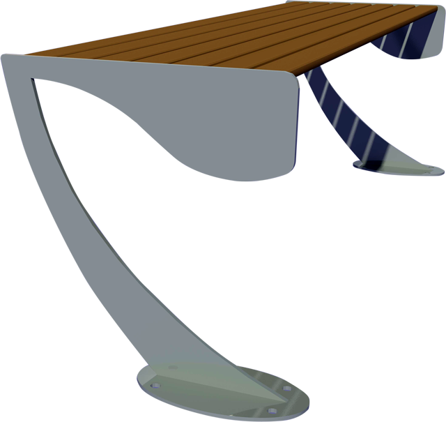 Materiali: due costole in acciaio spessore mm. 8 tagliate con plasma ad alta definizione collegate tra di loro dalla seduta costituita da doghe in legno Iroko trattato con impregnante, fissate con apposita viteria inox e alla base delle piastre per il fissaggio al suolo