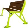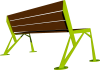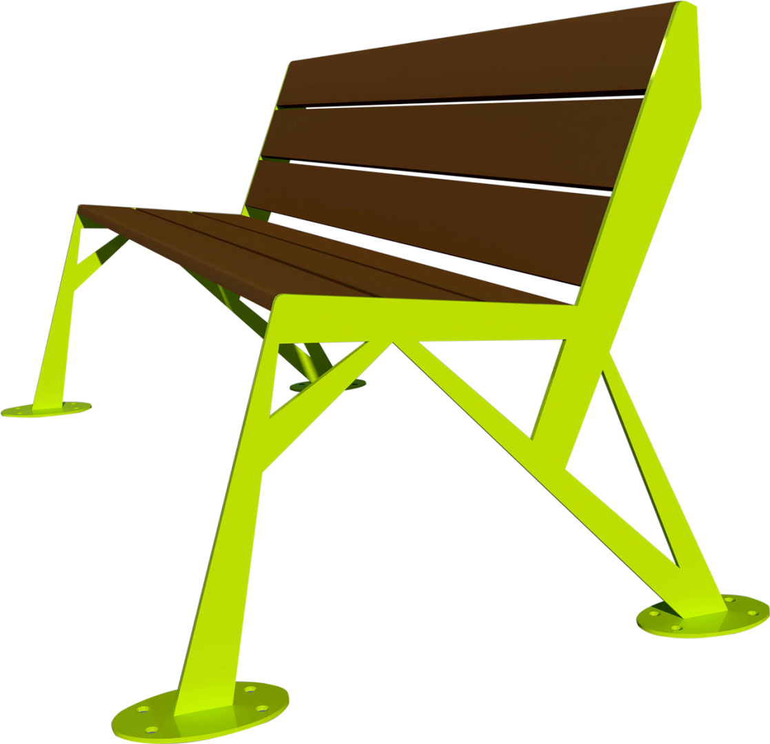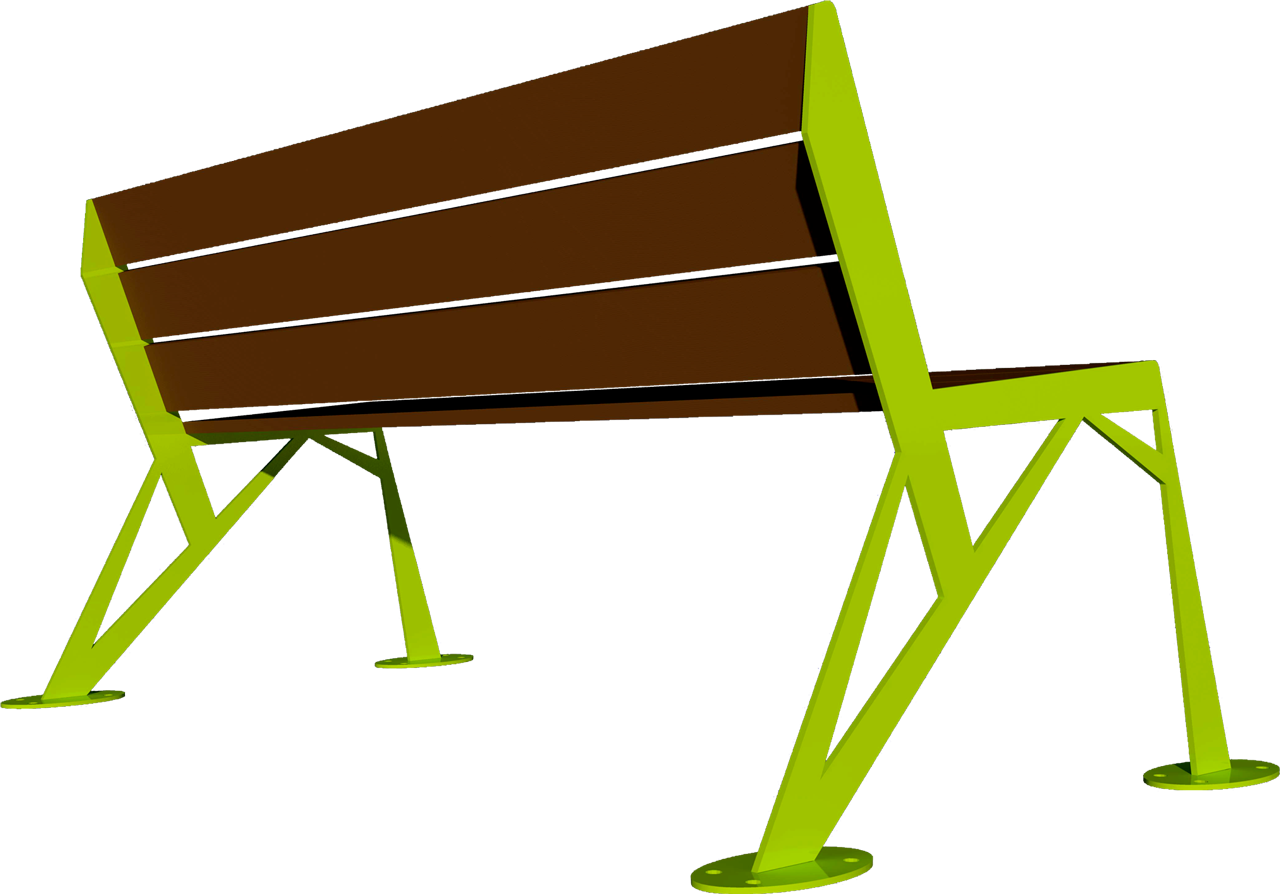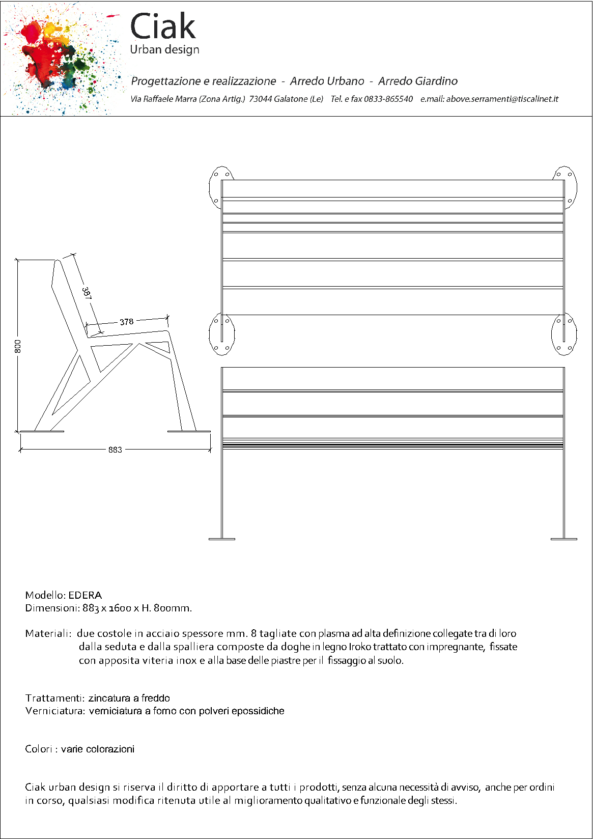 Materiali: due costole in acciaio spessore mm. 8 tagliate con plasma ad alta definizione collegate tra di loro dalla seduta e dalla spalliera composte da doghe in legno Iroko trattato con impregnante, fissate con apposita viteria inox e alla base delle piastre per il fissaggio al suolo.