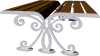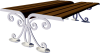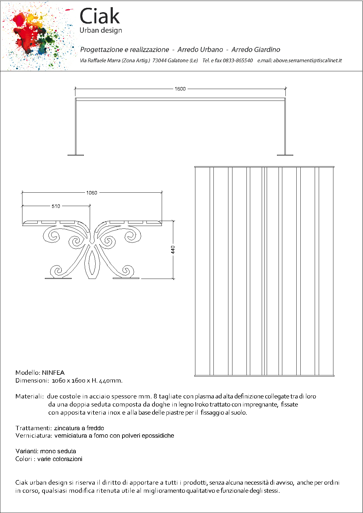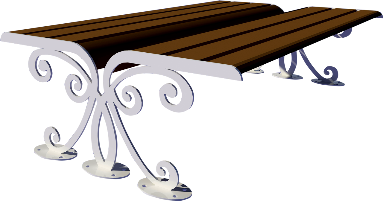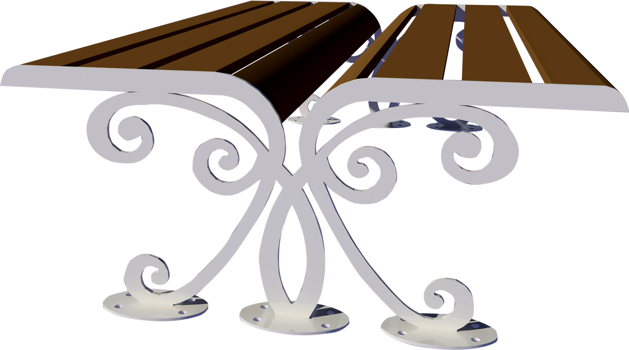 Materiali: due costole in acciaio spessore mm. 8 tagliate con plasma ad alta definizione collegate tra di loro da una doppia seduta composta da doghe in legno Iroko trattato con impregnante, fissate con apposita viteria inox e alla base delle piastre per il fissaggio al suolo.