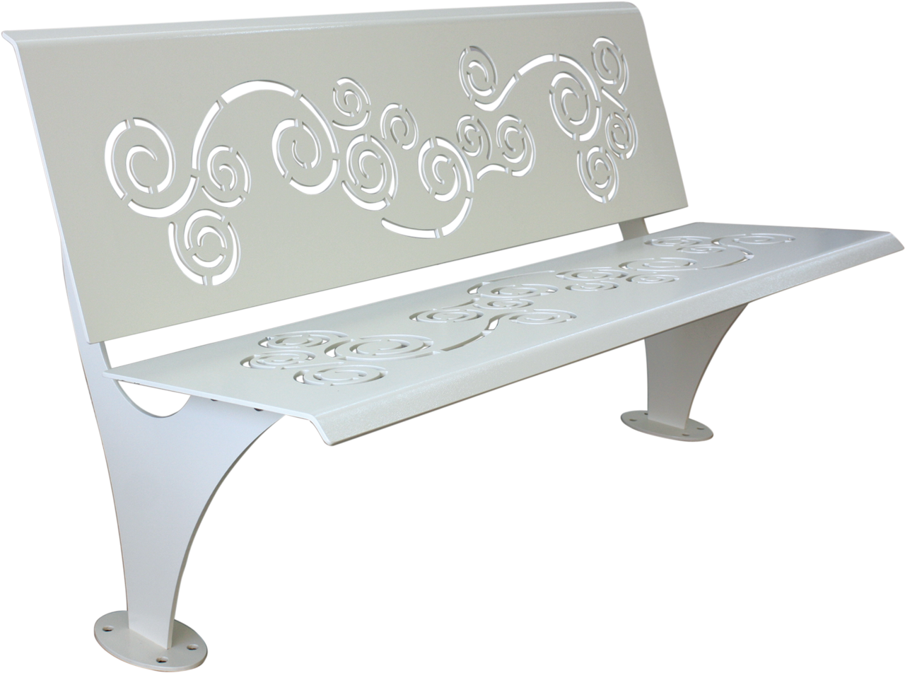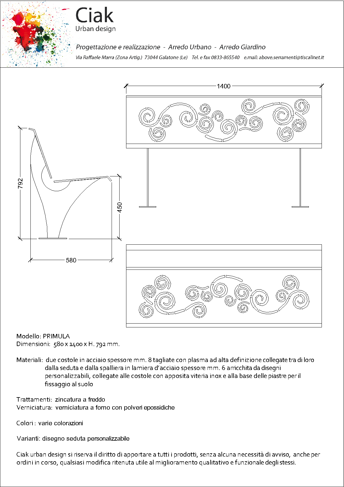 Materiali: due costole in acciaio spessore mm. 8 tagliate con plasma ad alta definizione collegate tra di loro dalla seduta e dalla spalliera in lamiera d’acciaio spessore mm. 6 arricchita da disegni personalizzabili, collegate alle costole con apposita viteria inox e alla base delle piastre per il fissaggio al suolo