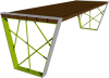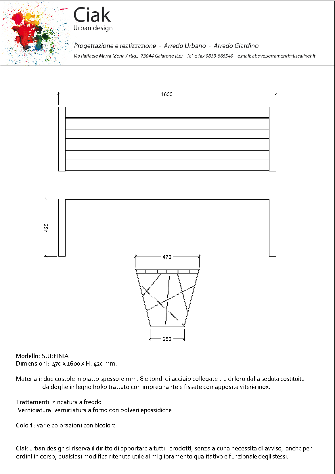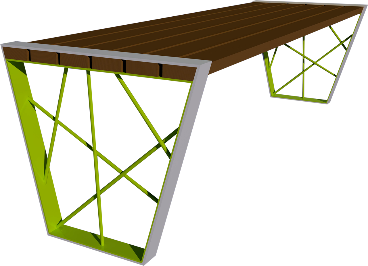 Materiali: due costole in piatto spessore mm. 8 e tondi di acciaio collegate tra di loro dalla seduta costituita da doghe in legno Iroko trattato con impregnante e fissate con apposita viteria inox.